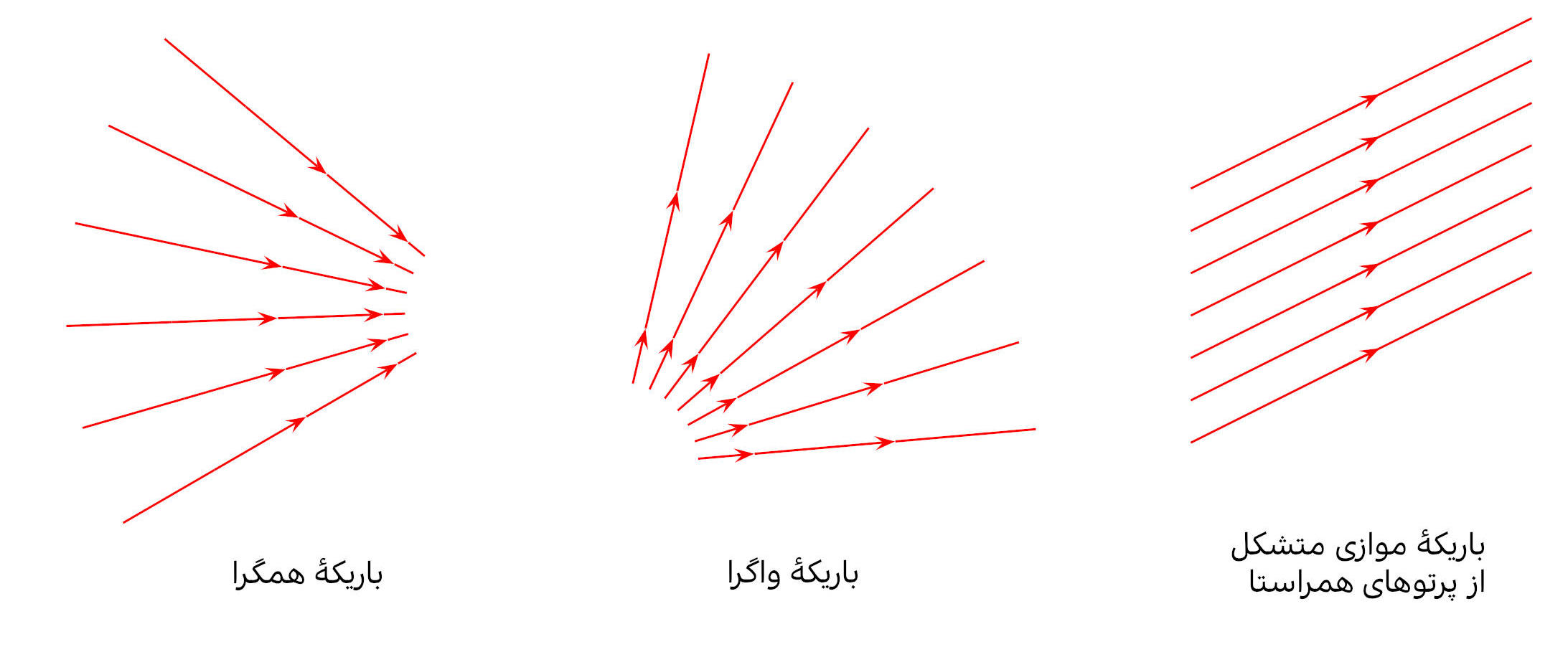 شکل میگیرد. باریکه، میتواند پهنای دلخواهی داشته باشد. در صورتی که پرتوهای یک باریکه همراستا باشند، باریکهٔ ما یک «باریکهٔ موازی» است (این حالت زمانی شکل میگیرد که در فاصلهٔ نسبتاً زیادی از منبع نور نقطهای قرار داشته باشیم). در غیر اینصورت اگر پرتوهای باریکه موازی نباشند در بعضی از نقاط و جهتها ممکن است از هم دور شوند و یا ممکن است به هم نزدیک شوند. در این حالت میگوییم باریکه در آن ناحیه از فضا به ترتیب «باریکهٔ واگرا» یا «باریکهٔ همگرا» است. وضعیت