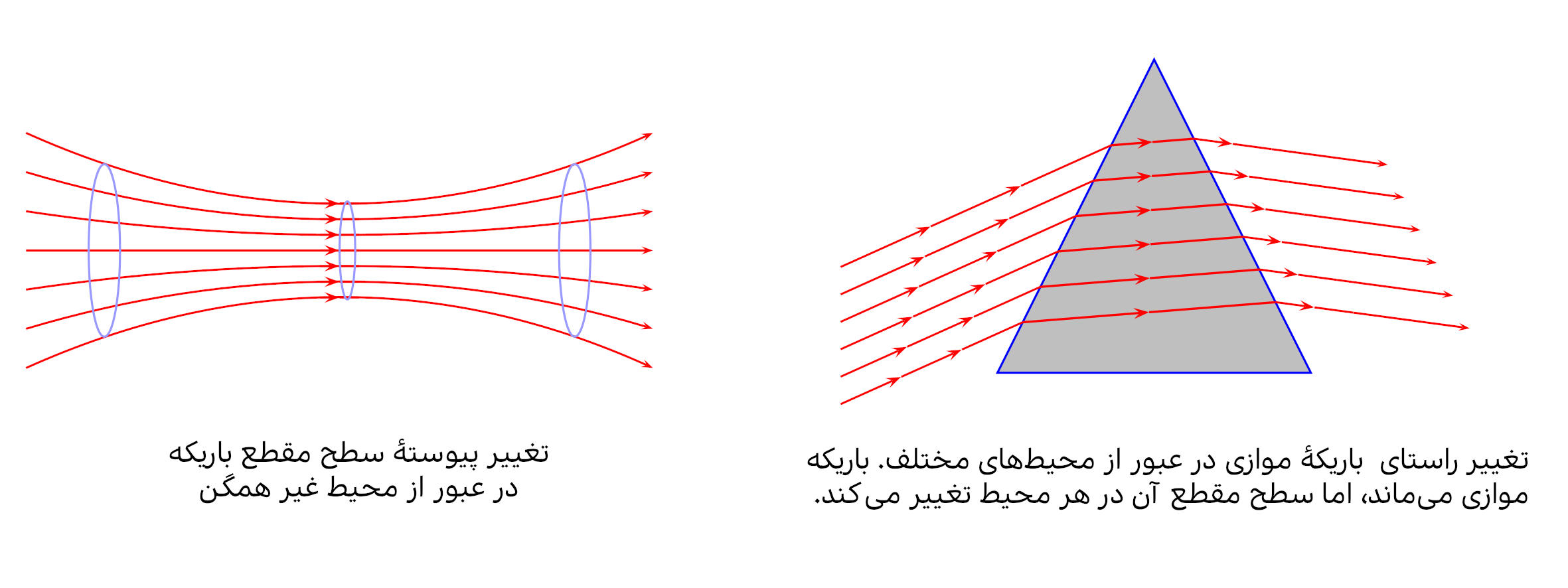 طبیعتاً سطح مقطع یک باریکهٔ همگرا و یا واگرا در حین انتشار تغییر میکند، امّا سطح مقطع یک باریکهٔ موازی هم لزوماً ثابت نیست. مثلاً ممکن است یک باریکهٔ موازی در یک نقطه از فضا سطح \(A_1\) را داشته باشد، امّا پس از عبور از یک مرز جدایی، سطح آن به \(A_2\) تغییر کند. از طرفی چون پرتوها و یا باریکهها در فضای سهبُعدی منتشر میشوند، بنابراین ممکن است دو باریکه یا دسته پرتو در فضا همدیگر را قطع کنند و یا اینکه متنافر باشند، یعنی هیچگاه در هیچ نقطهٔ مشترکی از فضا قرار نگیرند.