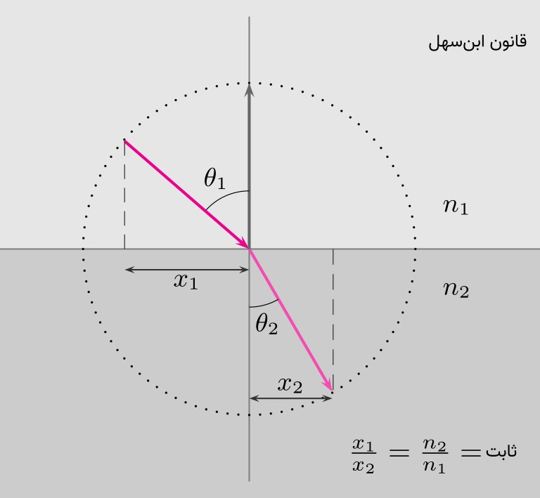دراینجا \(\theta_1\) زاویهای است که پرتو فرودی با بردار سطح میسازد و \(\theta_2\) زاویهای که بردار شکست با بردار سطح دارد. \(n_1\) و \(n_2\) هم به ترتیب ضریب شکست محیطهای اول و دوم هستند.