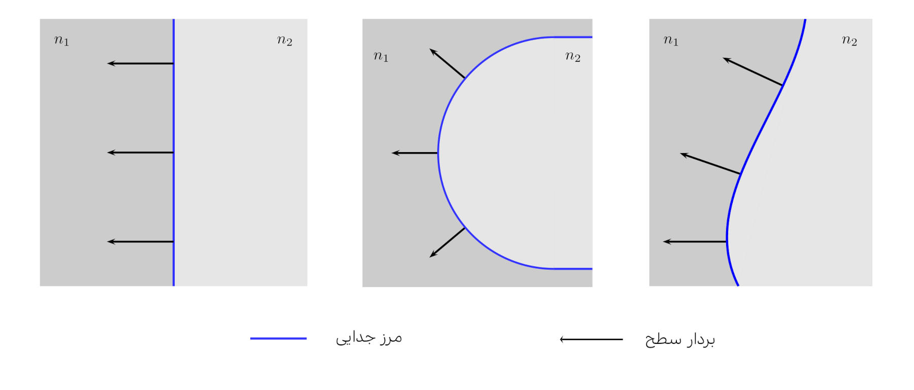 میگویند. این مرز جدایی توسط یک رویه یا سطح در فضا مشخص خواهد شد. در هندسه، رویه یا سطح با «بردار سطح» مشخص میشود. جهت این بردار، عمود بر سطح است. اگر مرز جدایی، یک سطح تخت باشد، جهت بردار سطح در تمام نقاط سطح ثابت و عمود بر سطح است. در غیر اینصورت، جهت بردار سطح در نقاط مختلف تغییر میکند.