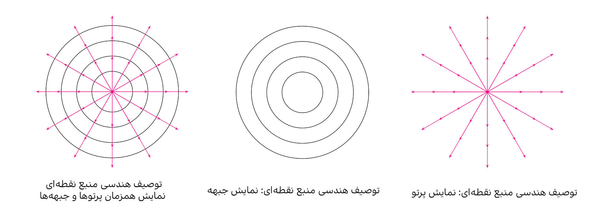 به عنوان مثال، دو توصیف هندسی برای منبع نقطهای (یا تصویر نقطهای) داریم. توصیف اول، خطوط واگرا (یا همگرا) از (یا به) یک نقطه در فضا است و توصیف دوم، رویهای کروی که مرکز آن منبع یا تصویر نقطه است. علاوه بر این، مقطع این توزیع خطوط یا رویه را با هر صفحهای در فضا میتوان مشخص کرد. در این مثال خاص، تصویر منبع نقطهای در تمام صفحات، مسیرهای دایروی را به عنوان مقطع جبهه و خطوط شعاعی در آن صفحه را به عنوان مقطع پرتوها تعریف میکند. در حالت کلّی، به همین ترتیب برای هر دسته پرتو یا باریکهٔ نامتقارنی هم میتوان پرتوها و یا جبههها را تعریف کرد. در اپتیک هندسی، نحوهٔ تغییر پرتوها و یا تغییر جبههها در حین عبور نور از محیطهای مختلف بررسی میشود.