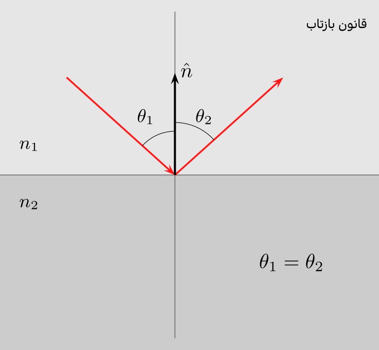 زاویهای که با بردار سطح میسازد، برابر با زاویهای است که پرتو فرودی با آن میسازد. به بیان ریاضی: \(\theta_1=\theta_2\). در اینجا \(\theta_1\)، زاویهٔ پرتو فرودی با بردار سطح و \(\theta_2\)، زاویهٔ پرتو بازتاب با بردار سطح است.
